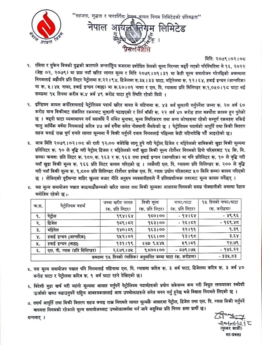 त्यस्तै खाना पकाउने ग्यासको मूल्य प्रतिसिलिण्डर २सय रुपैयाा बढेको छ । अब ग्यासको भाउ प्रतिसिलिण्डर १८ सय पुगेको छ । आयल निगमले नोक्सानी बढेको भन्दै इन्धनको मूल्य बढाएको हो । निगमका अनुसार बढेको मूल्य आइतबार राति १२ बजेदेखि लागू हुने छ ।