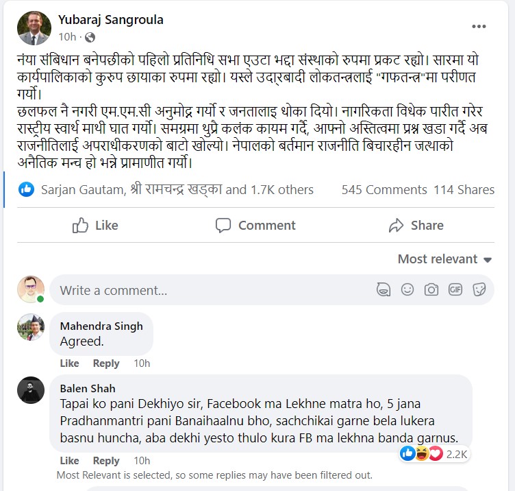 उनको उक्त स्टेटसको प्रतिक्रिया दिँदै बालेन साहले आफ्नो व्यक्तिगत फेसबुक आइडीबाट लेख्छन्, ‘तपाईको पनि देखियो सर, फेसबुकमा लेख्ने मात्रै हो। पाँचजना प्रधानमन्त्री पनि बनाइ हाल्नु भो, साँचिकै गर्नेबेला लुकेर बस्नुहुन्छ, अबदेखि यस्तो ठुलो कुरा फेसबुकमा लेख्न बन्द गर्नुस्।’