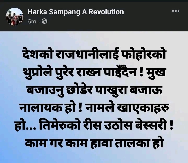 हर्कले पुनः तेस्रो पोस्ट गर्दै केहि आक्रोशको भाषा प्रयोग गरेका छन् । उनले भनेका छन्, ‘देशको राजधानीलाई फोहोरको थुप्रोले पुरेर राख्न पाइदैन । मुख बजाउन छाडेर पाखु बजाउ नालायक हो । नामले खाएकाहरु हो । तिमेरुको रिस उठोस बेस्सरी । काम गर काम हावा तालका हो ।’